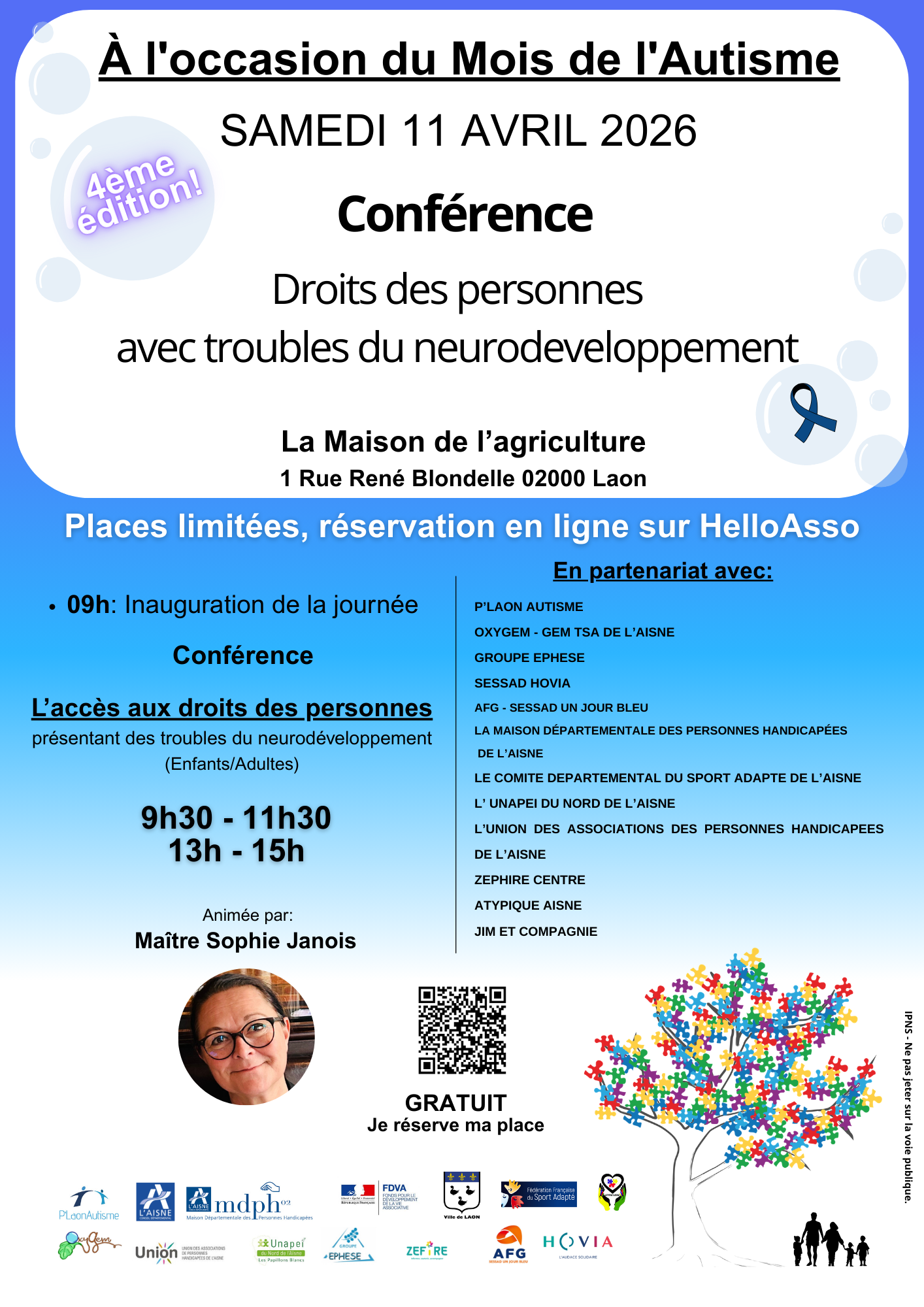 La Maison Départementale des Personnes Handicapées de l’Aisne (MDPH) et ses partenaires proposent, tout au long du mois d’avril, plusieurs rendez‑vous dédiés à la sensibilisation et à l’information autour de l’autisme.