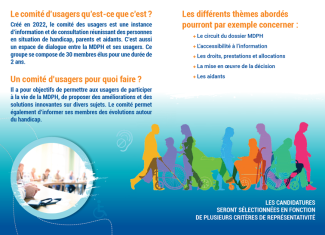 Le comité des usagers est une instance consultative composée d’une trentaine de personnes en situation de handicap, de parents et d’aidants de personnes en situation de handicap.